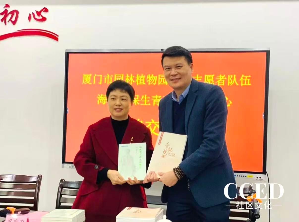 活动现场,厦门市植物园科普馆馆长梁育勤(左)与厦门市海沧区保生青草药传习中心主任程水燃(右)互赠书籍。
