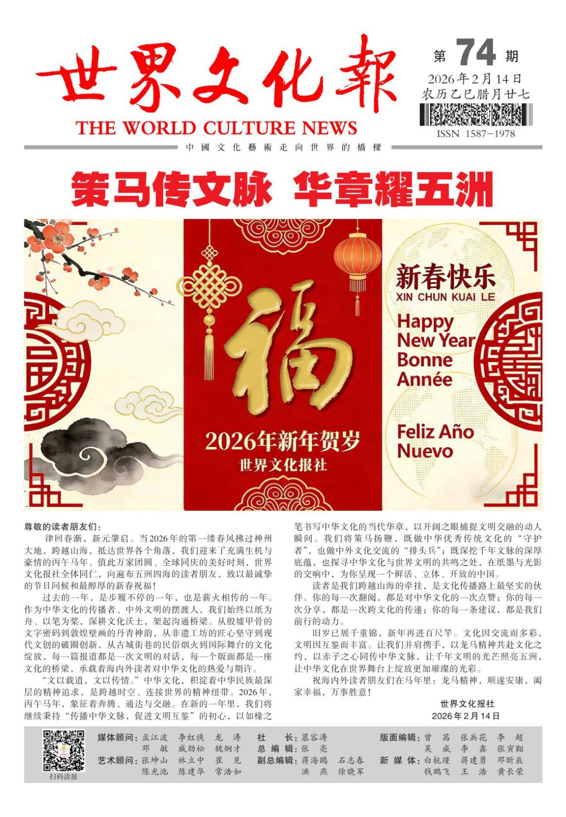 律回春渐,新元肇启。当2026年的第一缕春风拂过神州大地,跨越山海,抵达世界各个角落,我们迎来了充满生机与豪情的丙午马年。值此万家团圆、全球同庆的美好时刻,世界文化报社全体同仁,向遍布五洲四海的读者朋友,致以最诚挚的节日问候和最醇厚的新春祝福!
